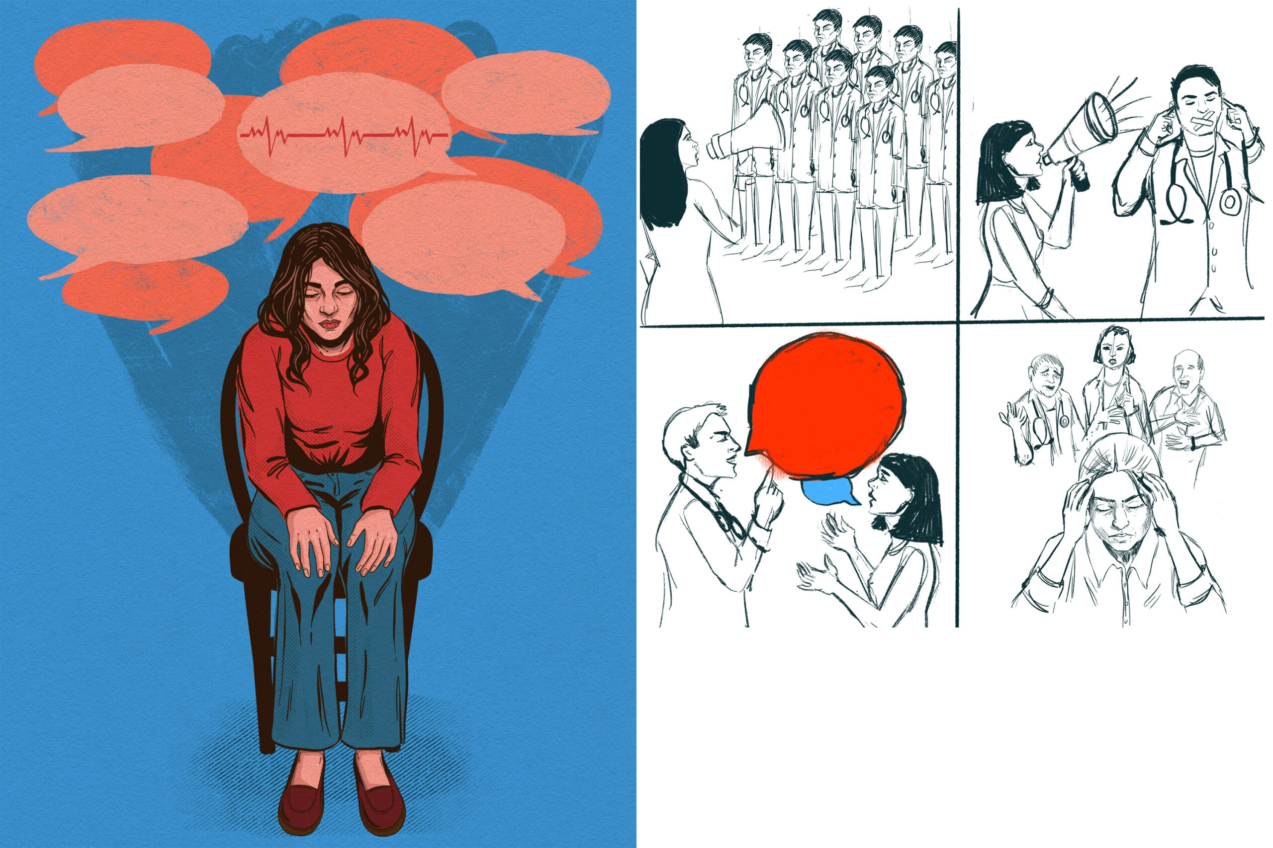 An independent illustration project exploring the challenges some women encounter in healthcare, including medical gaslighting and dismissal by providers. The sketches on the right present different conceptual approaches, while the final illustration on the left reflects the anxiety and frustration that can result from not being taken seriously.